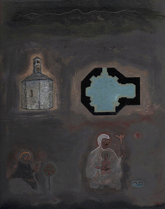 Seit 2020 waren Ausstellungsmöglichkeiten sehr vermindert worden, oder fielen aus. Im Jahr 2021 ist eine neue Werkgruppe entstanden, in Erinnerung an den Architekten Karl-Friedrich Schinkel, der 1822-24 die evangelische Bischmisheimer Kircher erbauen ließ. Die Kirche mit ihrem oktogonalen Grundriss wurde von Schinkel selbst entworfen. Im Jahr 2022 sollte in Saarbrücken eigentlich ein Schinkel-Symposium stattfinden, was zur Zeit eine offene Frage bleibt. Meine kleinformatigen Bilder zeugen von der langen, reichen Tradition oktogonaler Sakralbauten, speziell den Baptisterien.