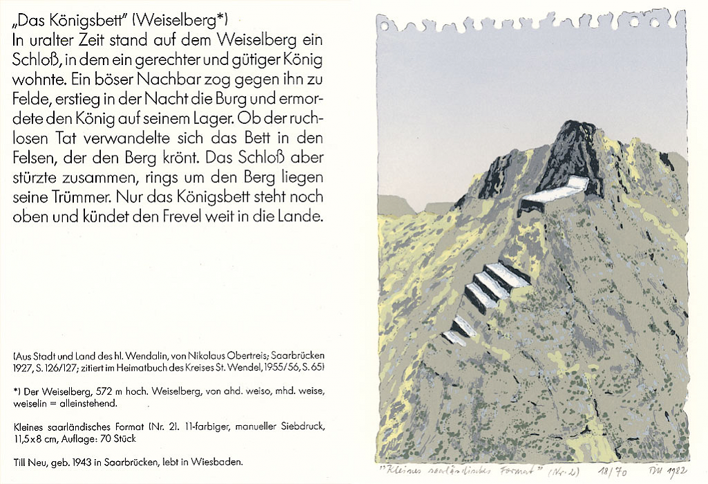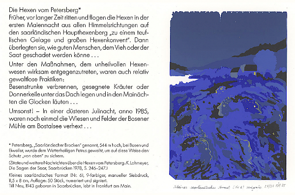 Zunächst mussten mir Freunde bei meinen ersten Auflagen-Drucken helfen. Seit 1976 konnte ich in einer selbst aufgebauten Werkstatt alleine drucken. Im Gegensatz zum plakativen Stil der Pop-Art und Agit-Prop-Art entwickelte ich auf postkartengrossen Formate eine Miniatur-Malerei, vor allem in der Reihe "Kleines saarländisches Format". Feinste Linien und reine Flächenfarben sollten auch im Siebdruck Qualitäten meiner Malerei bewahren. Notwendige Schablonen für die mehrfarbigen Drucke wurden bis auf wenige Ausnahmen mit der Hand gemalt, alle Auflagen seit 1974 mit einem Rakel manuell gedruckt. Auf Grund der umwelt- und körperschädlichen Werkstoffe habe ich mich vom Siebdruck abgewandt und 1993 ein letztes Mal auf meinem selbstgebastelten Drucktisch mit umweltfreundlichen Farben gedruckt. Die Auflagen, die lange Zeit vor allem in der Galerie Weinand-Bessoth in Saarbrücken verkauft wurden, sind fast alle vergriffen.