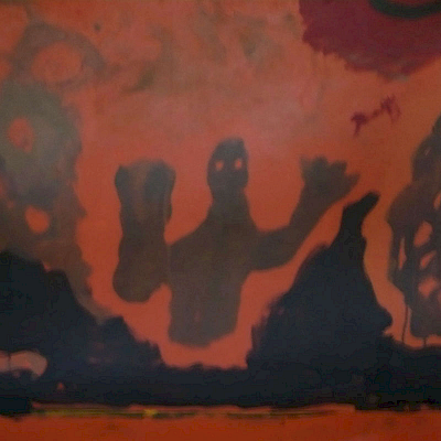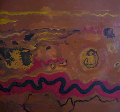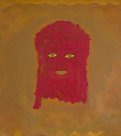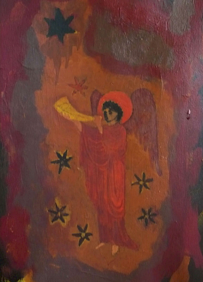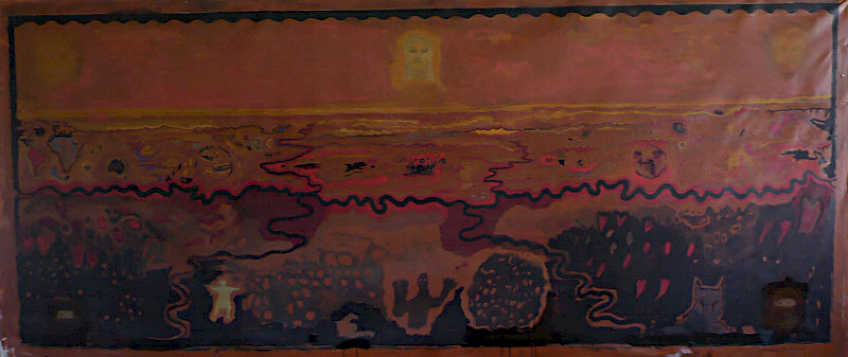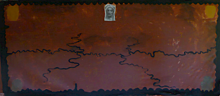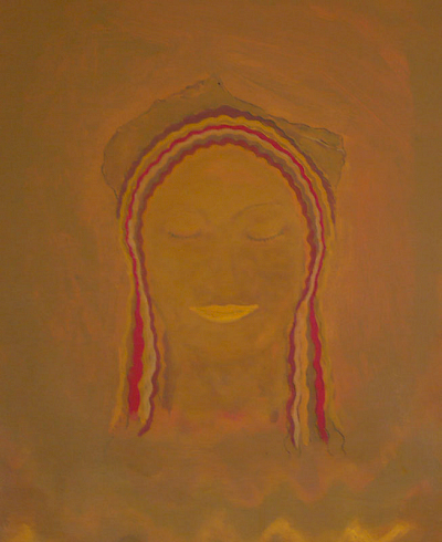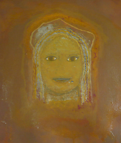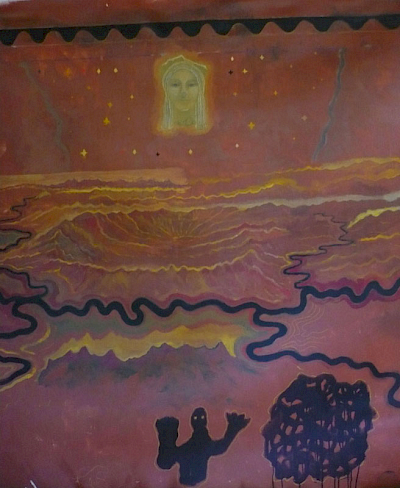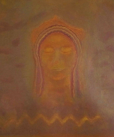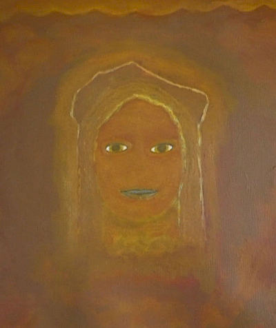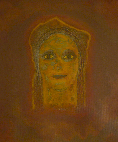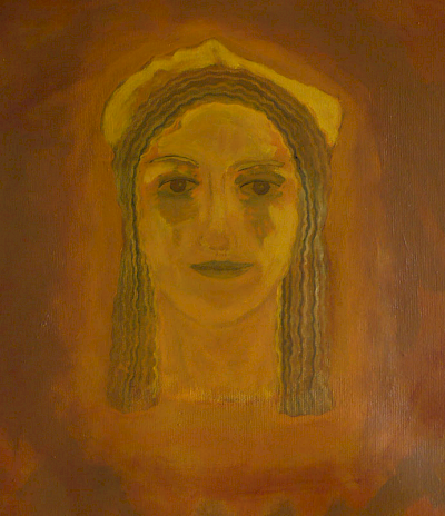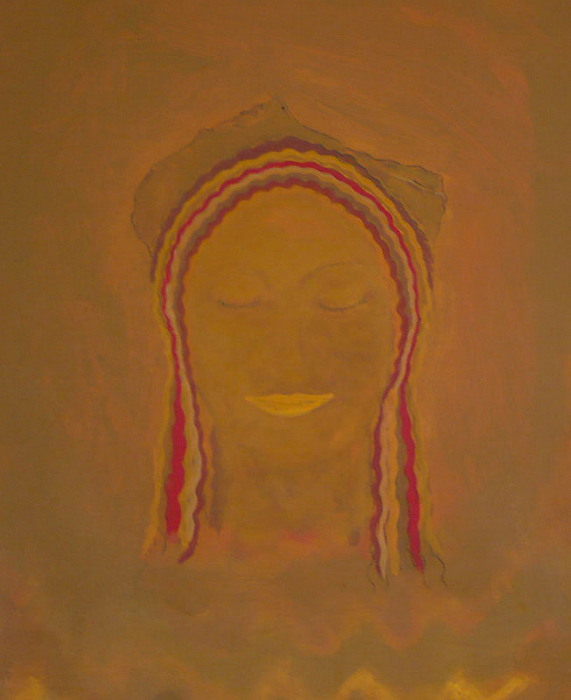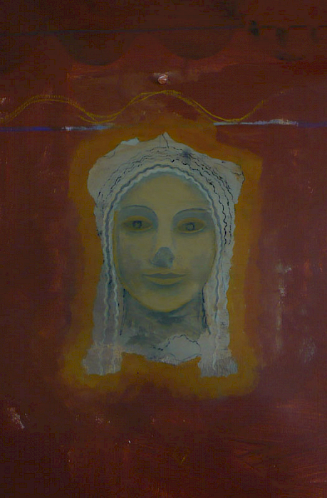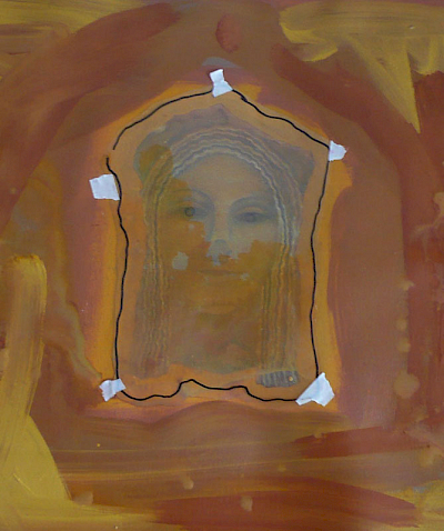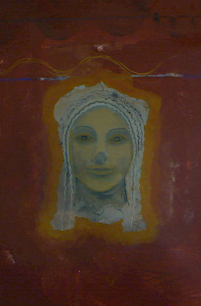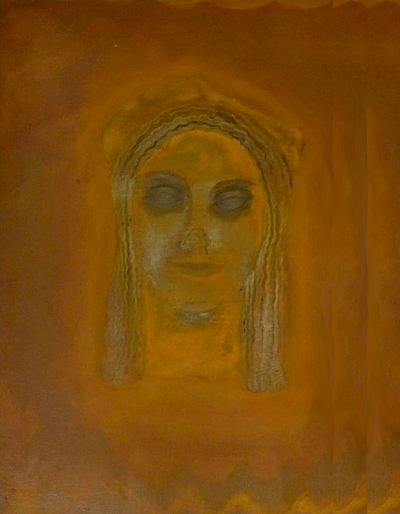 Doch die Idee mit dem Kopf mißlang. Zunächst erzeugte er mit seiner illusionistischen, dreidimension Realität einen unerträglichen Gegensatz zu dem teppichartigen Bild. Das Augenpaar der Kore fixierte! Als ich in der Himmelszone mit Untermalungen begann, schützte ich den Kopf mit einer Folie, doch die Farben sickerten über das Gesicht. Er war beschädigt. Das ermutigte mich, den Kopf irgendwie zu verändern, zu vereinfachen, „in das Bild zu holen“. Am Ende hatte ich den Kopf der Kore als formales Modell bewahrt, aber ihren Phänotyp verschwinden lassen und malte ein Antlitz mit gesenkten Lidern.