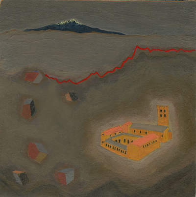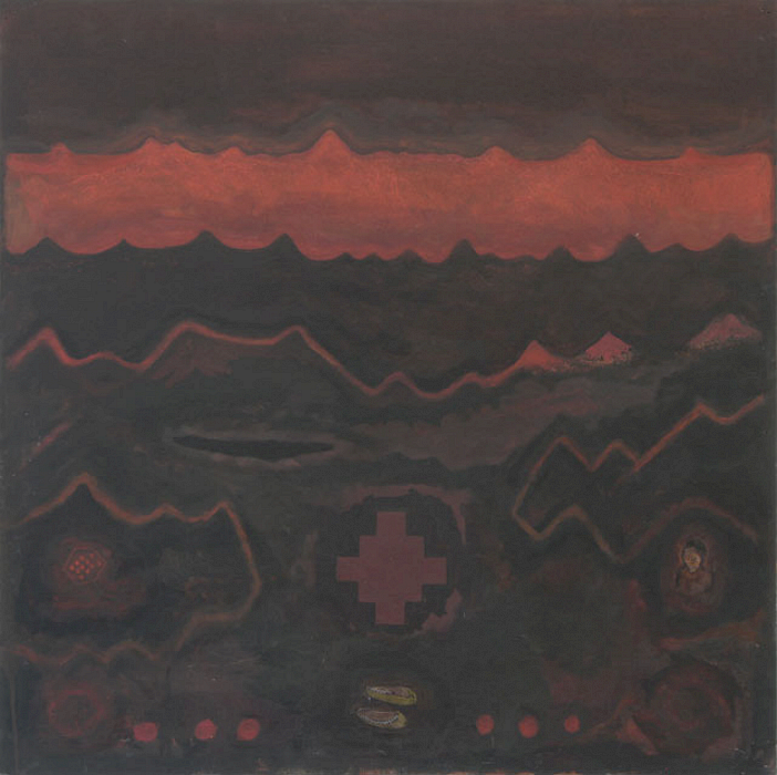 In der leeren Apsis der Johanniskirche in Saarbrücken war im Januar und Februar 2015 eine Installation mit Malereien der Werkgruppe „Mysterium der Berge“ zu sehen. Mittlere und kleinere Formate auf Karton sowie kleine, monochrome Holztafeln, die in dem Chorraum des neogotischen Sakralbaus still und anmutend leuchten sollten. Neben meinen eigenen Wanderungen diente mir das Internet als Quelle, wo ich „virtuell“ in der Bergwelt herumwanderte, z.B. in den Anden oder im Himalaya. Es ging um Schönheit und Ausstrahlung, Mythen und Historie der „Heiligen Berge“. Die meisten Orte, die in ihrer Entrücktheit und scheinbar ewigen, zugleich schützenden Kraft lange Zeit verehrt wurden, sind inzwischen erobert, entfremdet oder sonst wie gezielt gestört worden. Diese Ambivalenz hat mich sehr bewegt.