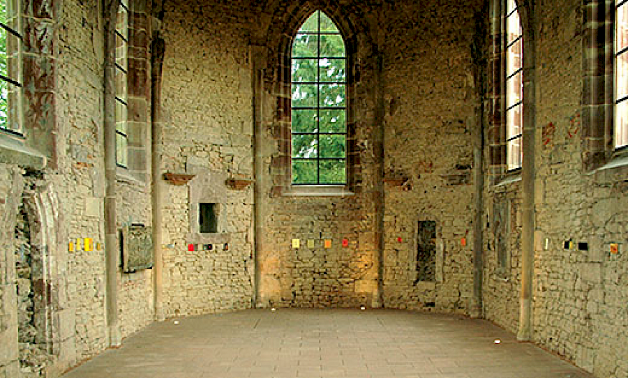 Der Rest eines mittelalterlichen Sakralbaus, die Wintringer "Kapelle", ist für einige Zeit mein Arbeitsplatz. Wie schön: ein leerer Raum, reich an Geschichte. Keine Liturgien, keine Geräte, kein Altar. Die Sandsteine des Mauerwerks sichtbar, die Fenster und Türen transparent. Wie waren die Wände einst bemalt? Vielleicht Skulpturen am Westportal? Vertreibung aus dem Paradies? Apokalypse?