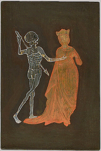 Meine Bilder erzählen von einer imaginierten Pilgerreise quer durch die Zeit. Wahrscheinlich lag die Wintringer Kapelle an einem Jakobs-Pilgerweg, der von Speyer nach Metz und am Ende nach Santiago da Compostela führte. Alle durften pilgern: Gläubige und Ungläubige, Arme und Reiche, Frauen, Männer, Kinder. Damals sah man in der Pilgerfahrt auch ein Gleichnis für unsere Lebensreise. Wir begegnen dem Guten, dem Bösen, der Liebe, der Gewalt, dem Frieden und dem Unheil, dem Tod. Vielleicht einigen Gespenstern und flüchtigen Geistern, in unserer Nähe oder in weiter Ferne.
